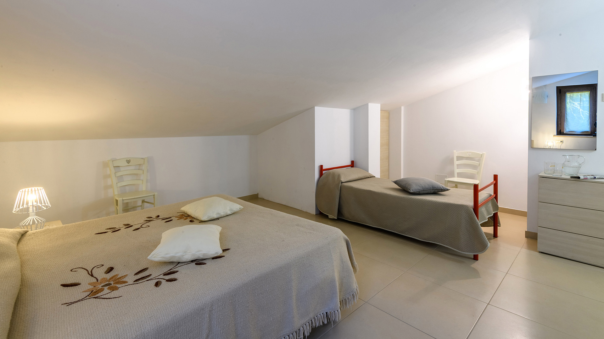 Al piano superiore troviamo invece una seconda camera matrimoniale con divano letto adatto per una persona e un bagno con doccia.