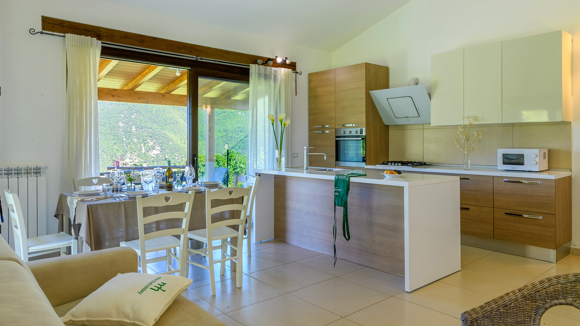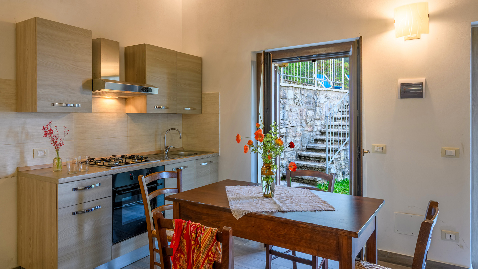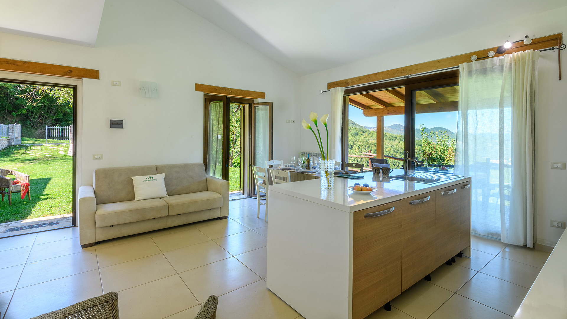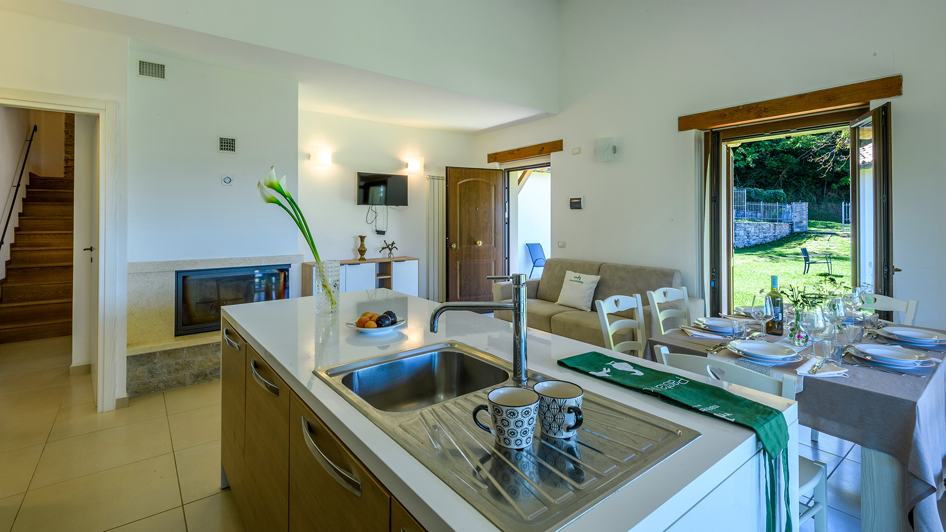L’appartamento si sviluppa su due piani. Al piano terra c’è uno spazio living open space composto da un soggiorno, dotato di camino e divano, e una cucina moderna e ben attrezzata. Tramite un’ampia porta-finestra si accede ad uno spazio esterno dove è possibile mangiare e godersi il panorama che si apre sul verde delle colline circostanti.