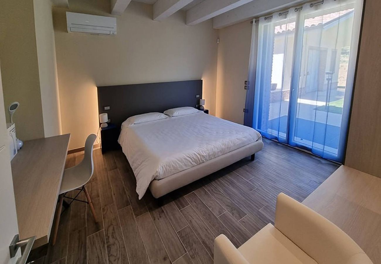 Al piano terra troviamo il soggiorno, ampio e luminoso, la sala da pranzo annessa alla cucina e collegata al portico attrezzato per mangiare all'aperto. Una camera matrimoniale con bagno con doccia ensuite, una camera doppia, un disimpegno con 2 letti singoli e un bagno con doccia. Un salotto arreda il portico che circonda la casa su due lati. Al primo piano sono presenti due camere matrimoniali e una doppia, un bagno con doccia, una toilette, una suite composta da studio, camera matrimoniale e bagno con vasca. Nella dependance adiacente alla piscina c'è un'area spogliatoio.