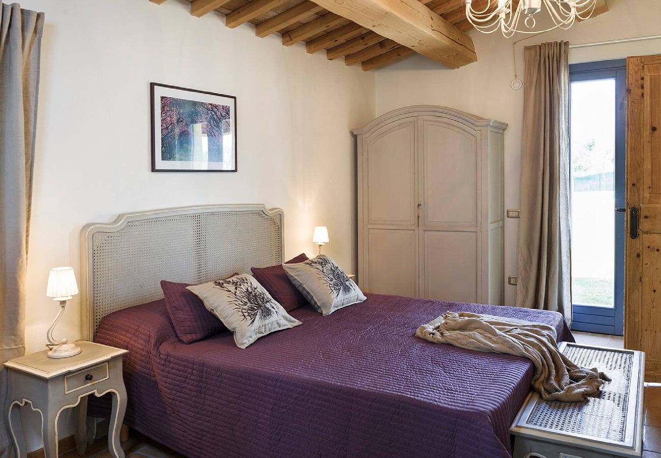 Salendo le scale, al primo piano, vi sono due camere matrimoniali ed una grande camera matrimoniale con bagno in camera con doccia. Sullo stesso piano si trova anche un bagno con doccia. Tutte le stanze sono dotate di aria condizionata.