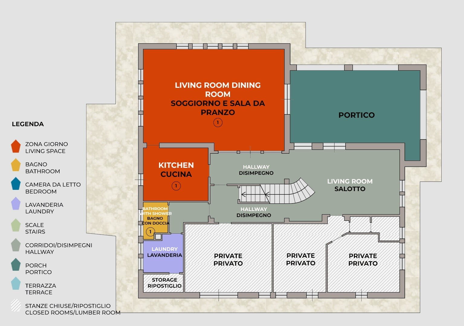 Al piano terra, un ampio portico coperto e dotato di arredi da giardino, vi conduce all’ingresso principale. Da qui si accede al grande soggiorno con camino, troviamo poi una cucina in muratura, un bagno con doccia, la lavanderia e una stanza uso dispensa.