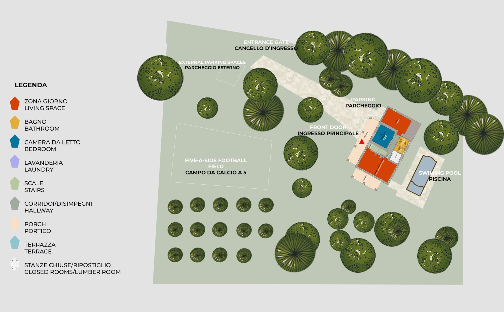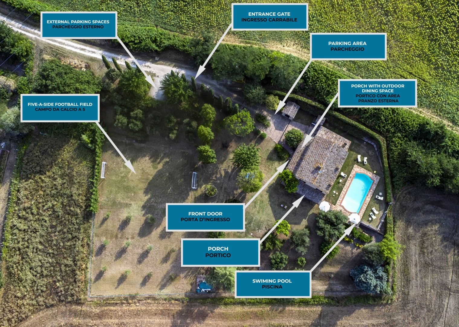 Links von der Treppe liegt die Familiensuite: ein Arbeitszimmer mit zwei Einzelbetten (mit Klimaanlage), das mit dem Doppelzimmer (mit Klimaanlage) und dem angrenzenden Badezimmer mit Dusche, WC, Waschbecken und Bidet verbunden ist. Der ca. 2500 m² große Garten von „La Girolima“ ist eine Oase der Ruhe und natürlichen Schönheit. Er bietet sowohl Grünflächen als auch funktionale Bereiche für Freizeitaktivitäten und Entspannung. Die Veranda der Villa bietet direkten Blick auf den mit Olivenbäumen und hohen Bäumen geschmückten Garten. Hier laden einladende Entspannungsbereiche mit Sofas, Sesseln und einem Esstisch (für acht Personen) zum Verweilen ein. Dieser Bereich eignet sich perfekt zum Mittagessen, Lesen, Plaudern mit Freunden oder einfach nur, um den Blick in den Garten zu genießen. In einer Ecke des Gartens befindet sich ein Kleinfeld für Kleinfeldfußball. Der Garten ist von einem ca. 1,70 m hohen Maschendrahtzaun umgeben – ideal für alle, die mit ihrem Hund anreisen. Der Haupteingang ist ein elektrisches schmiedeeisernes Tor, das die Zufahrt für Fahrzeuge ermöglicht. Daneben befindet sich ein separater Fußgängereingang. Innerhalb des Grundstücks, in der Nähe des Eingangs, gibt es einen praktischen Parkplatz. Direkt vor dem Eingangstor befinden sich zwei weitere, leicht zugängliche Parkplätze. Der Swimmingpool befindet sich im hinteren Teil des Anwesens und bietet einen herrlichen Blick auf das nahegelegene Städtchen Mondavio.