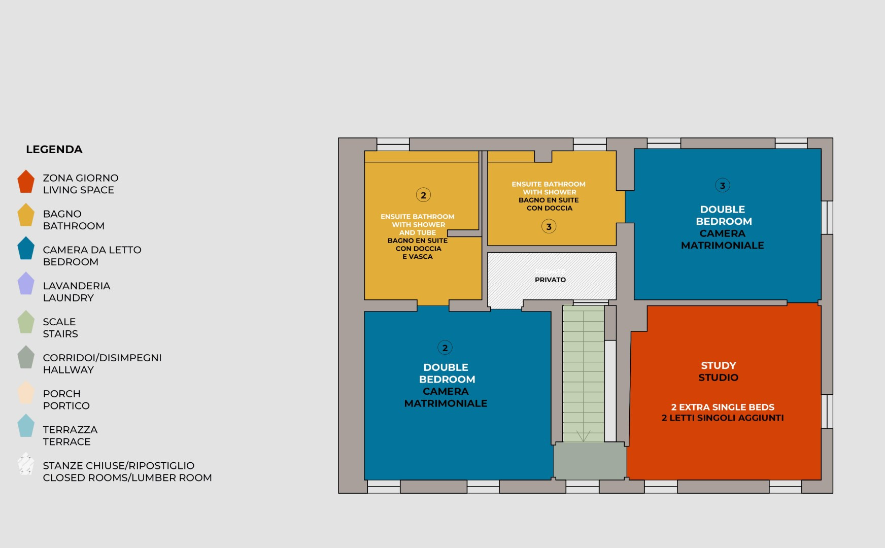 Im ersten Stock gibt es ein Schlafzimmer mit Doppelbett und eigenem Badezimmer mit Dusche und Badewanne sowie eine Suite, bestehend aus einem Arbeitszimmer mit zwei Einzelbetten, das mit dem Schlafzimmer mit eigenem Badezimmer mit Dusche verbunden ist.