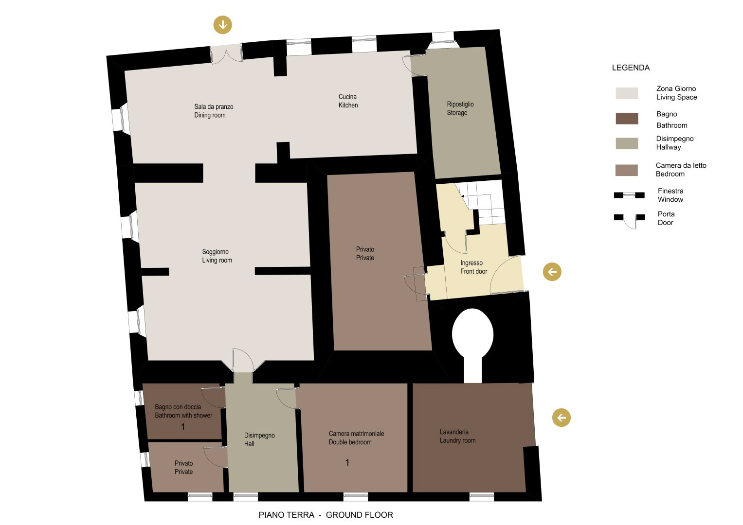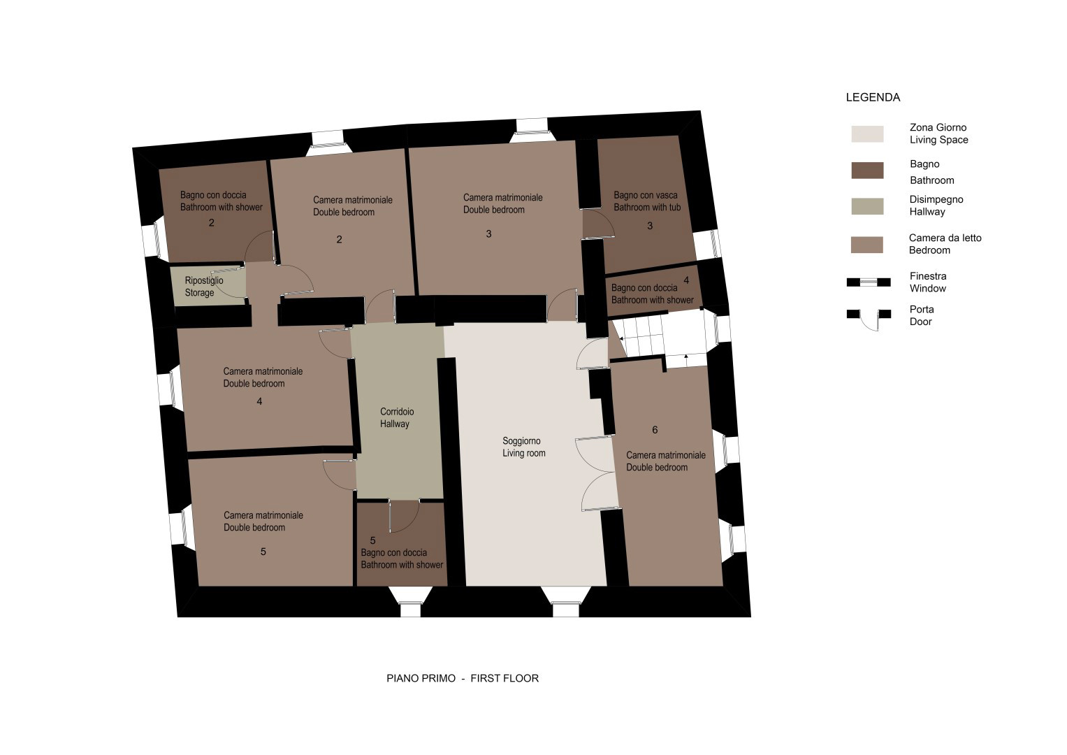 Op de begane grond is de keuken ruim, licht en goed uitgerust; hier bevindt zich een eetkamer, een grote woonkamer met open haard, een autonome ruimte met studeerhoek, een tweepersoonskamer en een badkamer met douche. Op de bovenverdieping bevinden zich een woonkamer met open haard, een tweepersoonskamer met een eigen badkamer met douche, nog eens 4 tweepersoonskamers en 3 badkamers waarvan één met bad en 2 met douche.