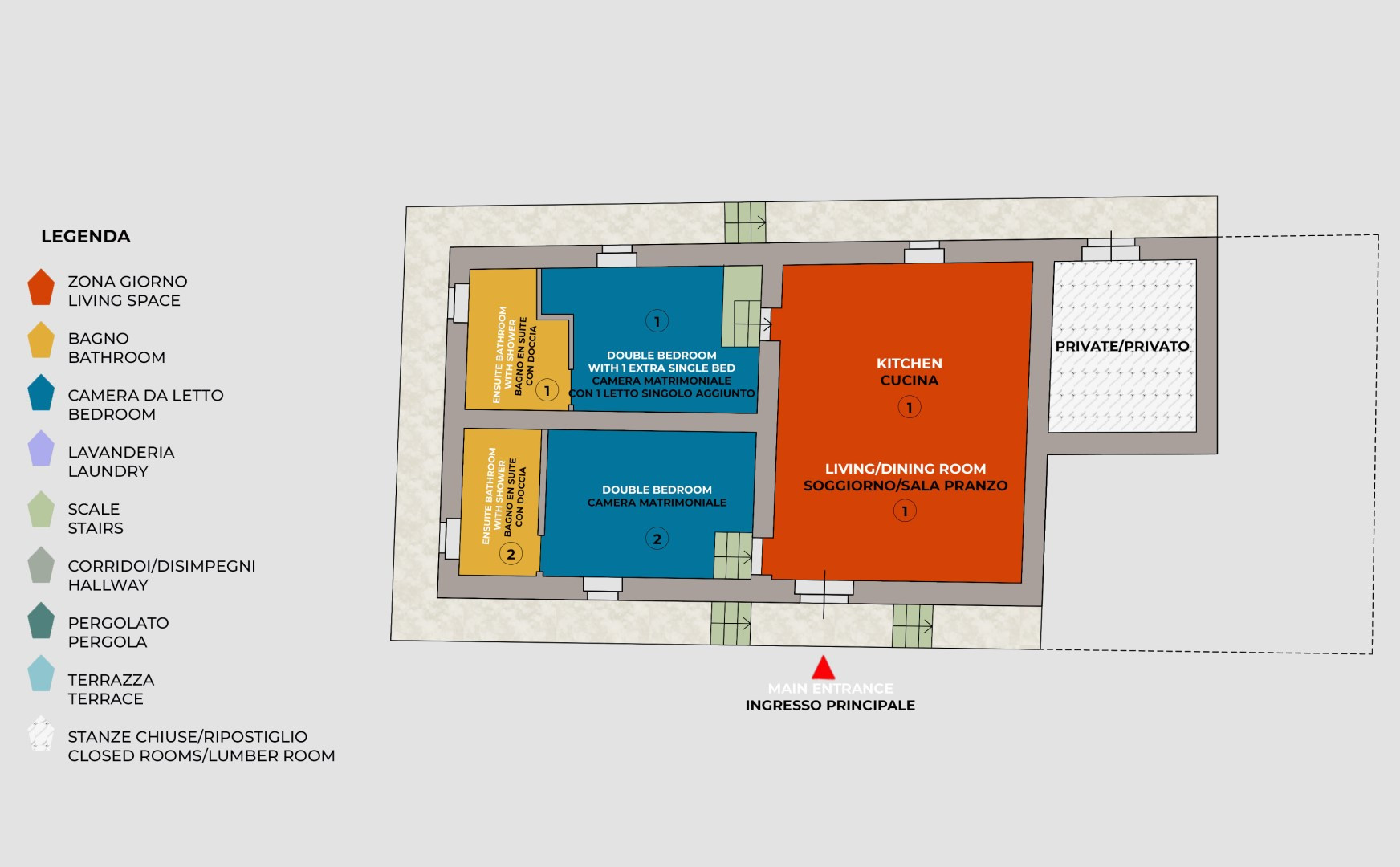 The property is divided into two spacious apartments, each with independent entrance, offering a total of five bedrooms, all with en-suite bathrooms. FALCO (Ground Floor): This apartment comprises a large living room with fireplace and sofa, three double bedrooms, two of which with an additional single bed, and three en-suite bathrooms with shower. Guests can enjoy a private loggia with table and chairs for al fresco dining and relaxing. PETTIROSSO (First floor): This apartment has a large living room, two double bedrooms, one with an additional single bed, and two private bathrooms with shower. Guests have access to a front garden with a gazebo furnished with a table and chairs, perfect for outdoor dining.