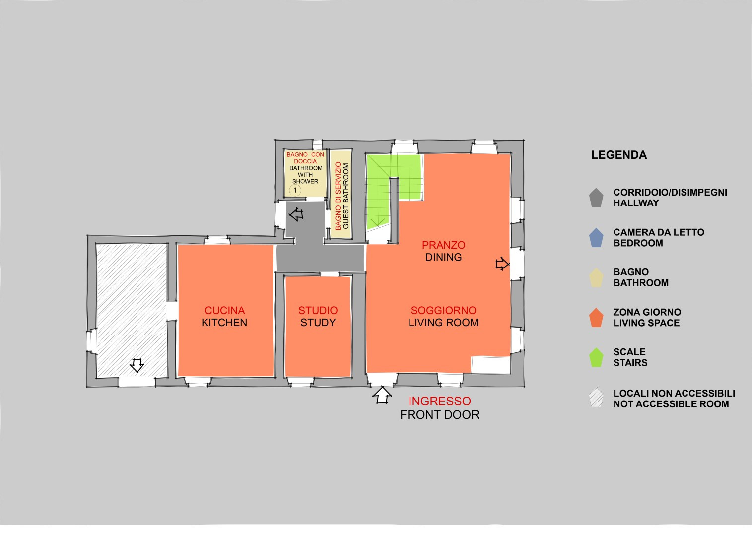 The main entrance leads directly to the bright and welcoming living room, equipped with a fireplace and connected to the panoramic terrace with a brick gazebo, perfect for outdoor dining and relaxing. On the ground floor there is also a study, a fully equipped kitchen with island, a bathroom with shower and a service bathroom with washing machine. On the first floor, Casale Partemio has four double bedrooms, a small terrace and two bathrooms with shower, offering the right privacy and comfort for each guest.