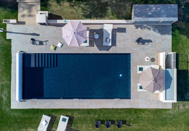 On the ground floor, there's a spacious and bright living room and a dining room adjacent to the kitchen, leading to the porch furnished for outdoor dining. There's a double bedroom with an ensuite bathroom with shower, a twin bedroom, a hallway with two single beds, and a bathroom with shower. A living room adorns the porch that surrounds the house on two sides. The first floor features two double bedrooms and a twin bedroom, a bathroom with shower, a toilet, and a suite comprising a study, double bedroom, and bathroom with tub. The annex adjacent to the pool has a dressing area.