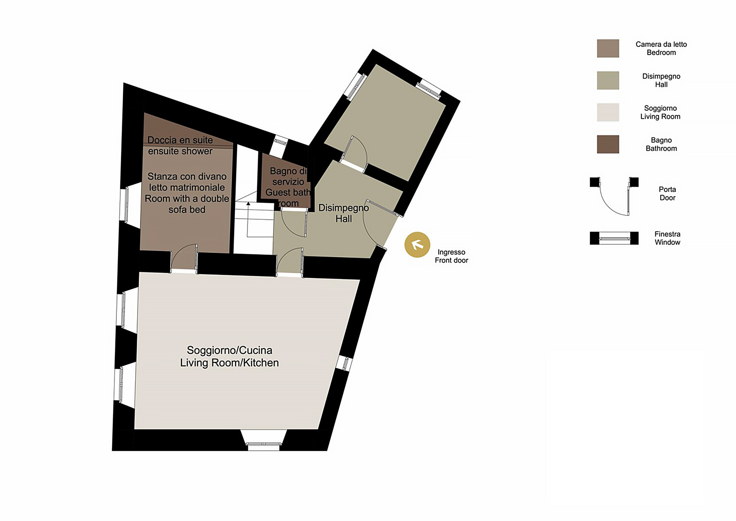 The entrance leads into the warm-toned living room/kitchen, with glass doors overlooking the garden and heated pool. On the ground floor is a bedroom/living room with sofa bed, featuring a glass shower and a half bath.